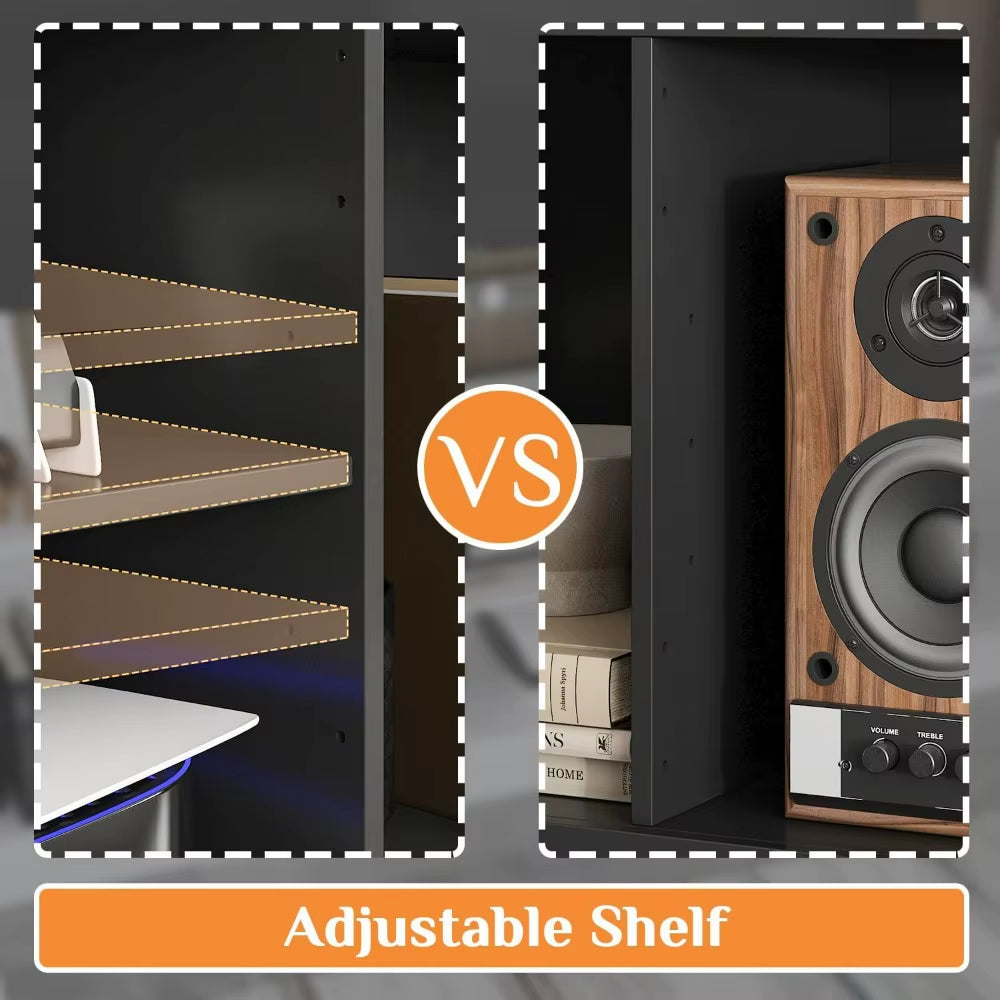 • [Large Storage Space] - This black TV stand for TVs up to 75 inches comes with ample storage space, it offers total 18 storage compartments, and the open shelf on the TV console table is adjustable with pre-drilled holes, you can easily adjust heights or remove the shelf to store larger items like fireplace. The doors on the top shelf are lift-up to open.