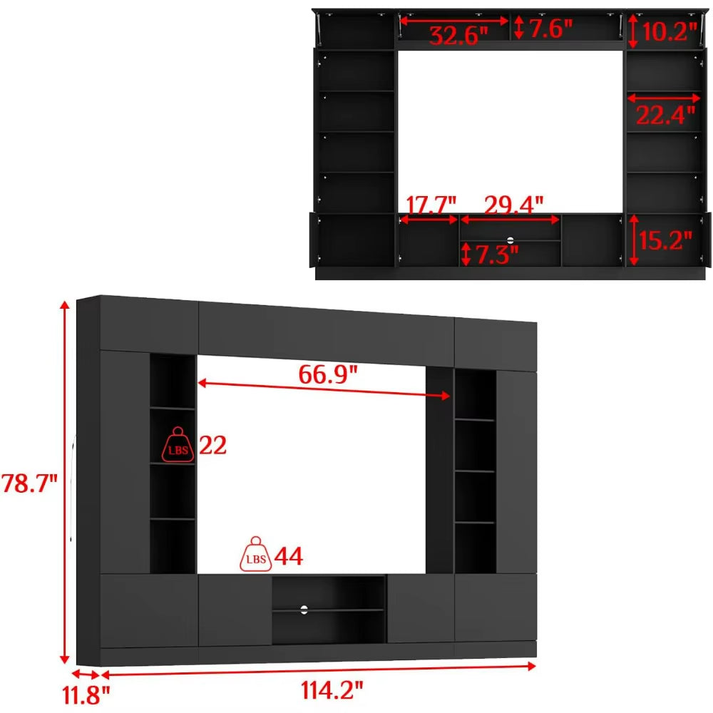 • [Package Contents & Dimensions] - Overall sizes: 114"W x 11.8"D x 78.7"H, sizes of the TV console: 66.6"W x 11.8"D x 19.5"H, wall mounted top shelf: 66.6"W x 11.8"D x 11.7"H, tall bookshelf: 23.5"W x 11.8"D x 78.7"H. This wall unit will come in 2 boxes and may not arrive at the same time, the hardware and the manual are in one of the boxes.