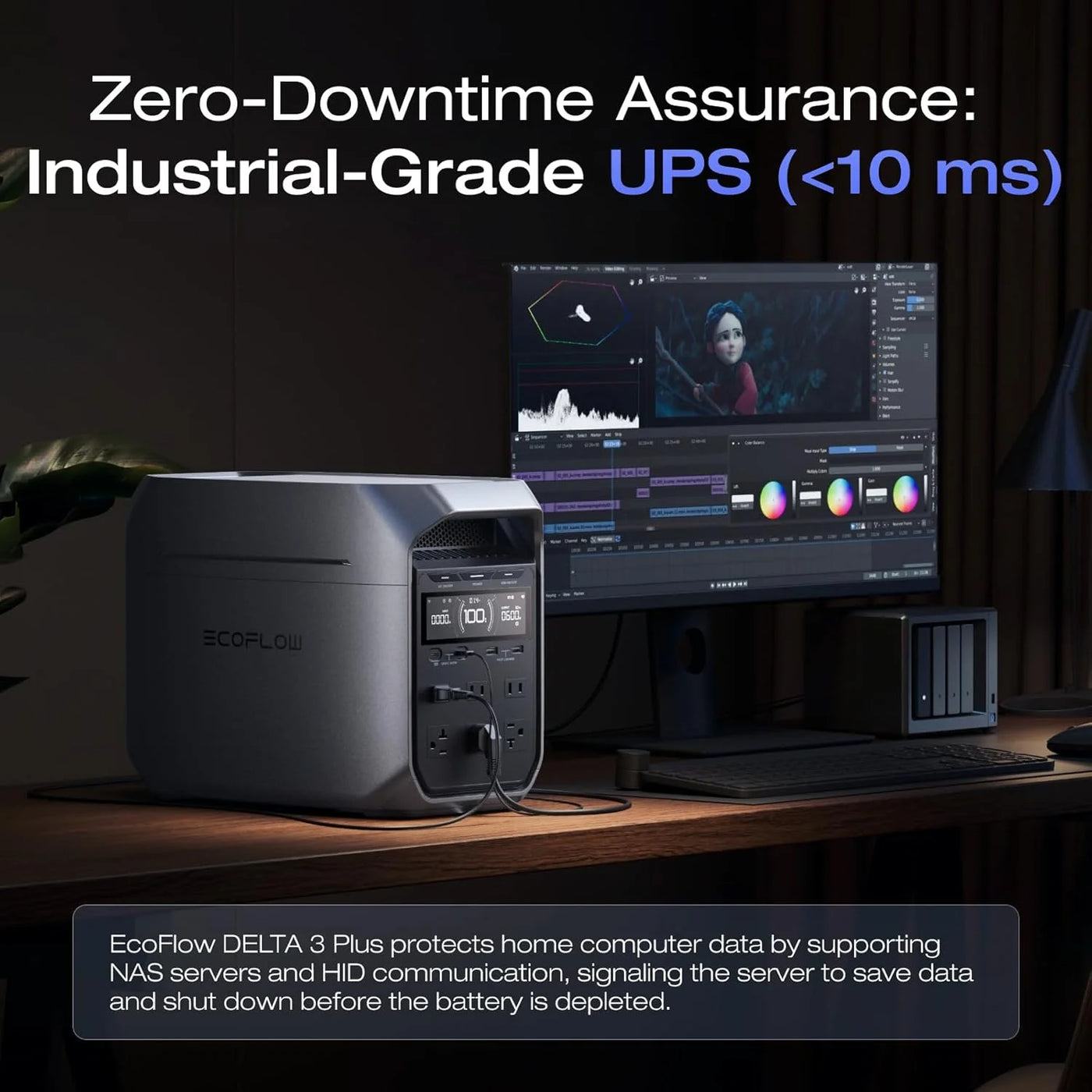 • 10 ms Switch-Over UPS Protection. The DELTA 3+ functions as a true UPS with a 10 ms switch-over time, ideal for NAS, servers, POS systems, and critical backups, ensuring no data loss from unexpected shutdowns.