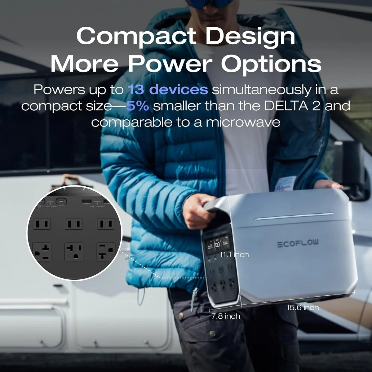 • Compact & Portable Design So You Can Enjoy Endless Power On-The-Go.At 5% smaller than its predecessor, the EcoFlow DELTA 3+ is space-saving and portable. Whether it's in your car or at home, it seamlessly fits into tight spaces without sacrificing power.