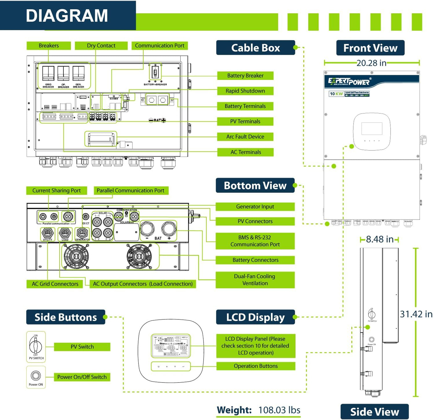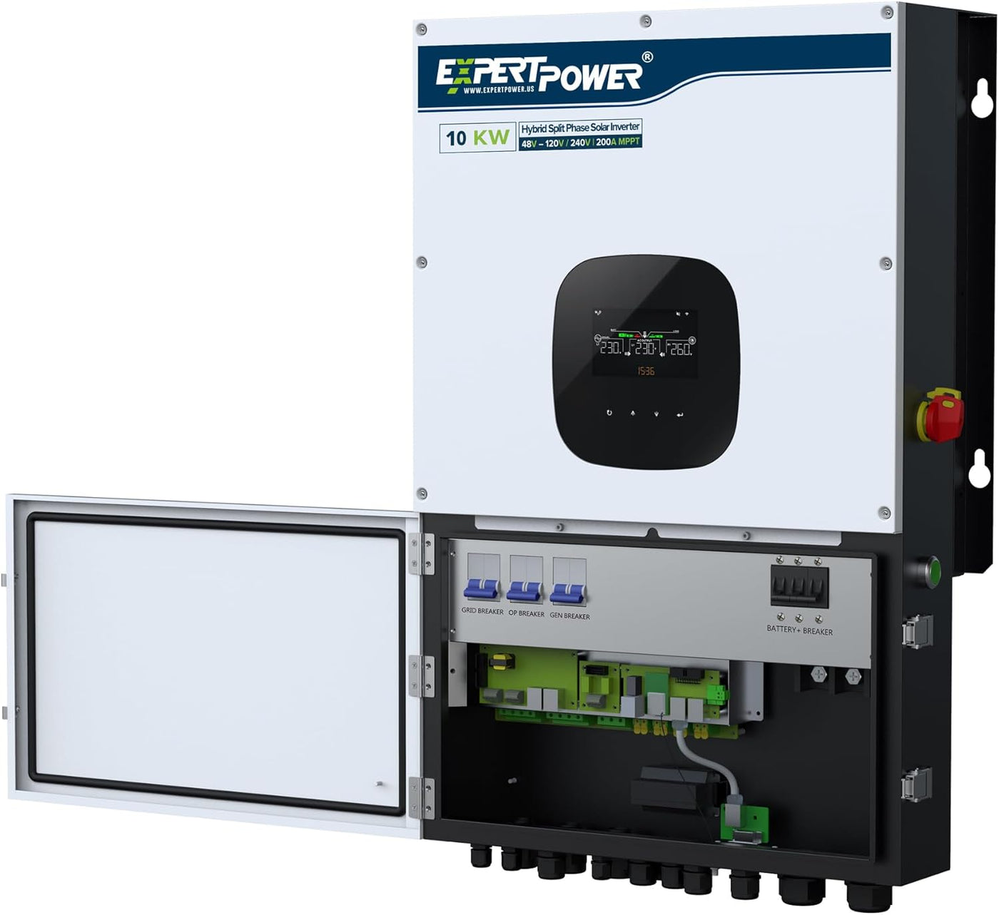 • Robust Specifications: Dual 100A MPPT charge controllers and a 10KW pure sine wave inverter ensure efficient operation. Supports two solar panel array inputs, simultaneously maximizing power from both sources. Offers a 10KW rated output (20KW surge), compatible with 120/208/240Vac. The ability to handle substantial power through its dual controllers allows for optimized solar energy usage, ensuring that your system operates at peak efficiency throughout the day.