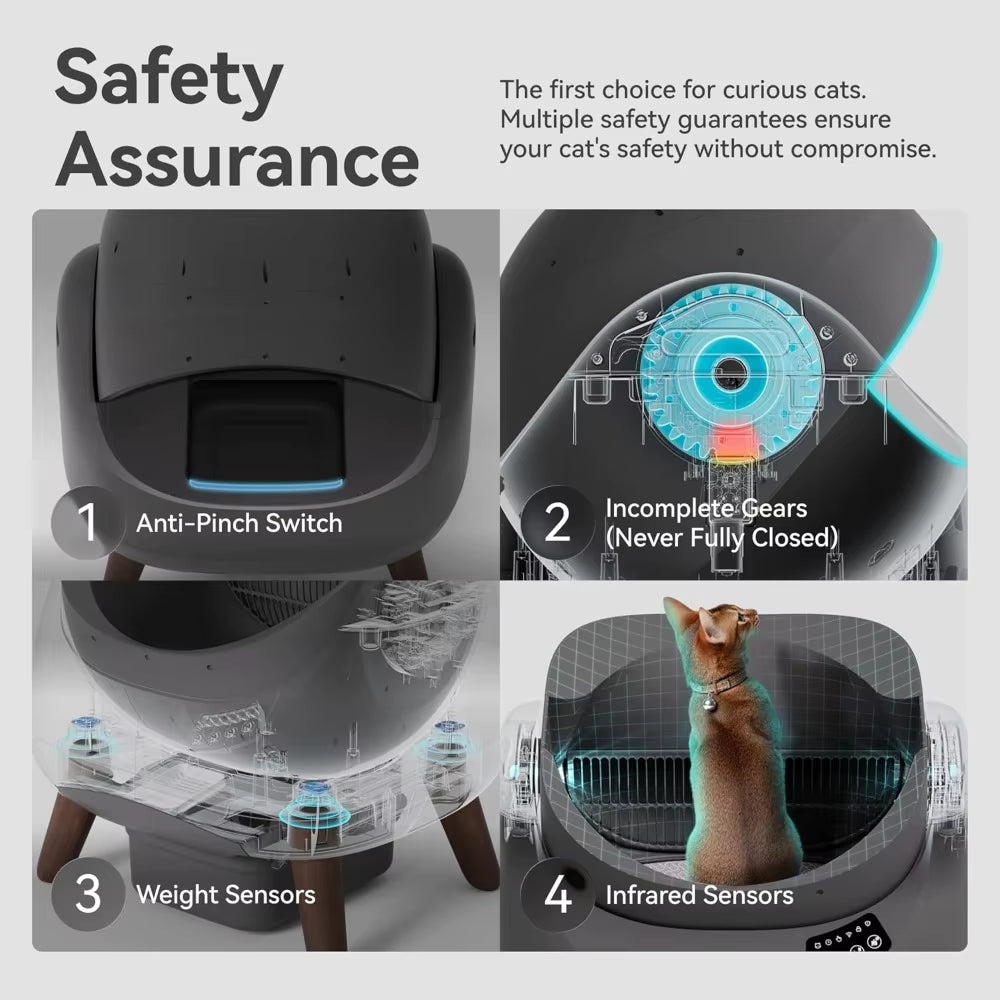 Always-Open Safe Entrance: The first choice for curious cats. Open-X automatic cat litter box features an incomplete gear design that keeps the entrance always open, preventing trapped cats or safety hazards. With weight sensors, infrared sensors, and anti-pinch switches, your cat is fully protected